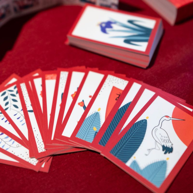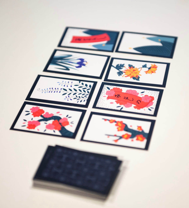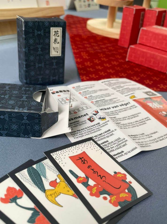 Saját tervezésű Hanafuda – vagy magyarul Virágkártya – játékszabállyal, segédlettel. 48 lap, a lapok mérete 41 x 63 mm.
